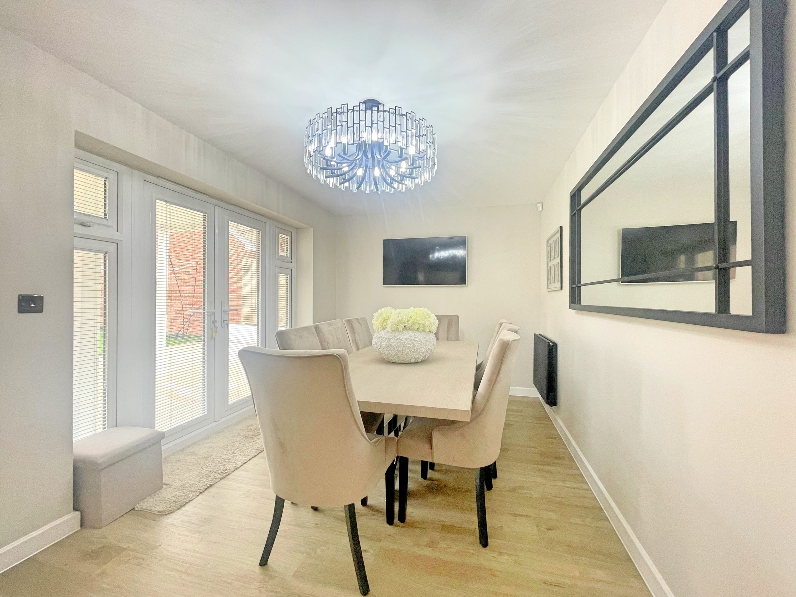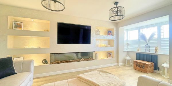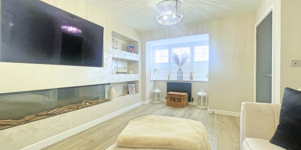 UPVC bay window with fitted blinds, media wall and radiator.