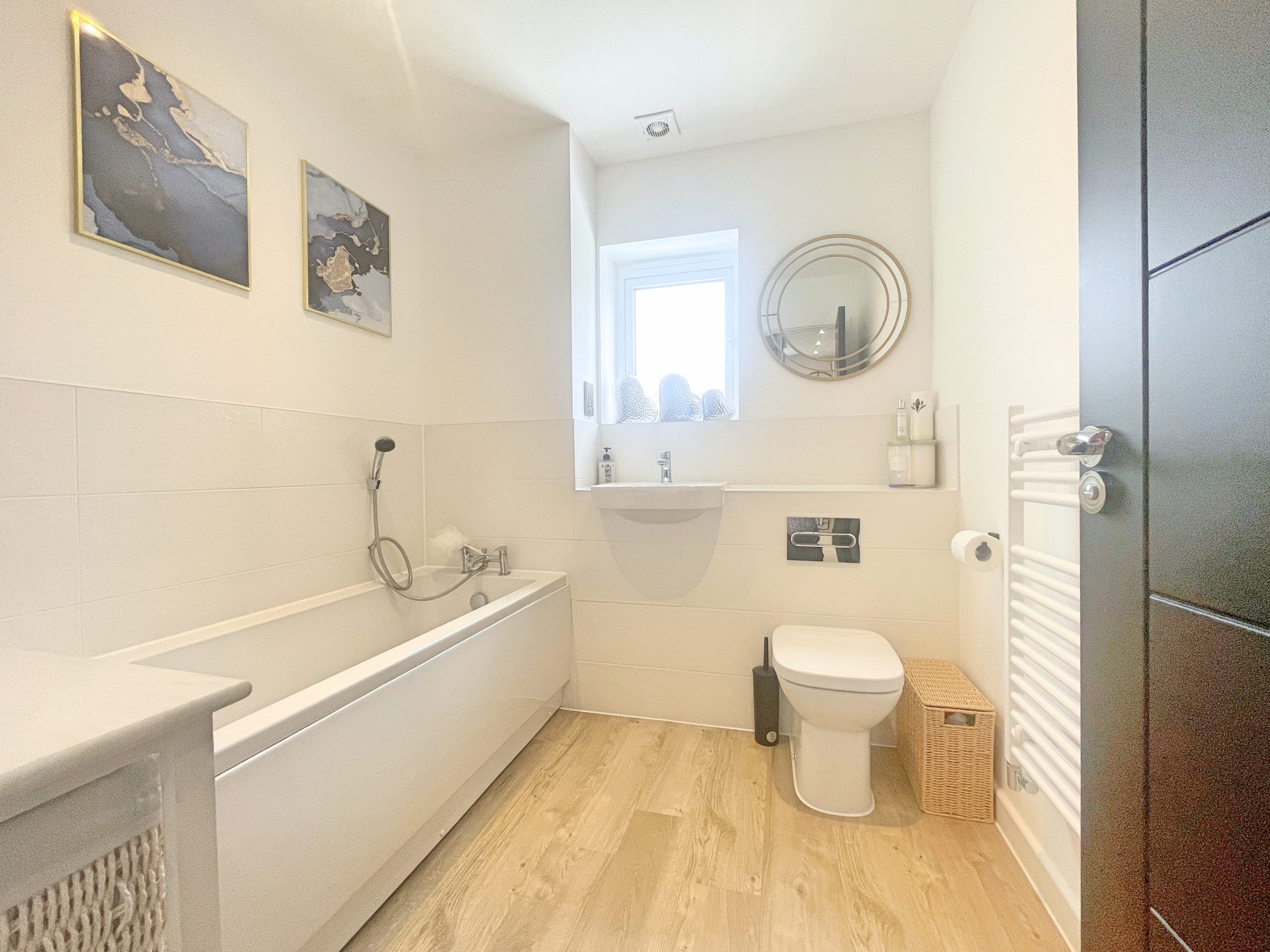Obscure UPVC window to rear, heated towel rail, toilet, wash hand basin, bath, LVT flooring and ceiling spotlights.