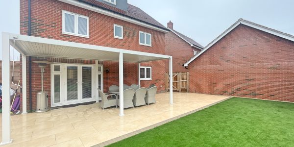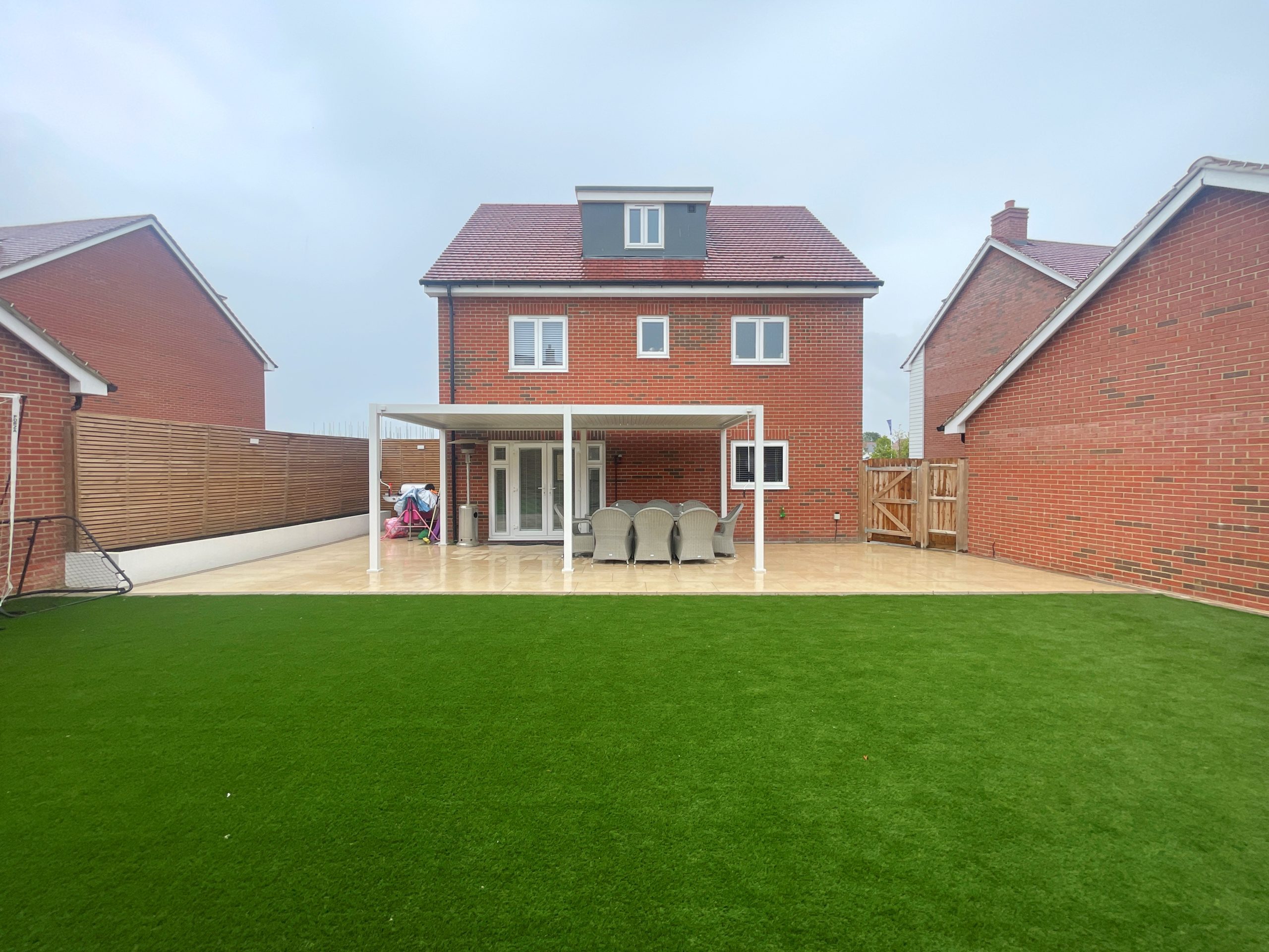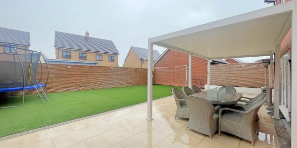 Porcelain tiled terrace, retractable pergola, artificial grass and access to drive via a side gate.
